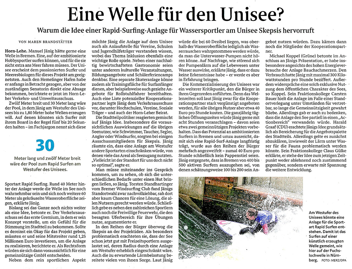 Im Beirat Horn-Lehe wurde das Projekt einer Rapid-Surfing-Anlage am Unisee vorgestellt. Der Weser-Kurier berichtete im Stadtteil-Kurier vom 26.01.2023 über "Eine Welle für den Unisee?"